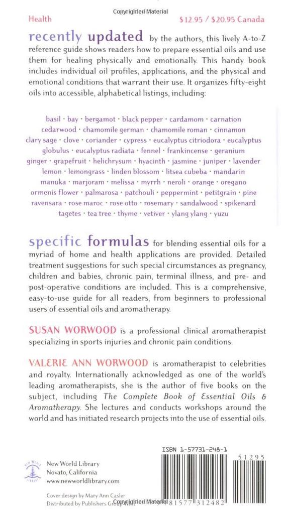 Specific formulas for blending essential oils for a myriad of home and health applications are provided. Detailed treatment suggestions for such special circumstances as pregnancy, children and babies, chronic pain, terminal illness, and pre- and post-operative conditions are included.